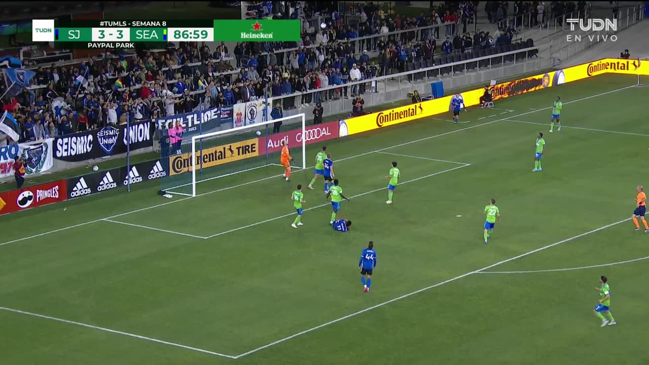 Tiro atajado al ángulo superior derecho. Jeremy Ebobisse (SJ Earthquakes) disparo de cabeza desde el centro del área. Asistencia de Paul Marie con un centro al área.