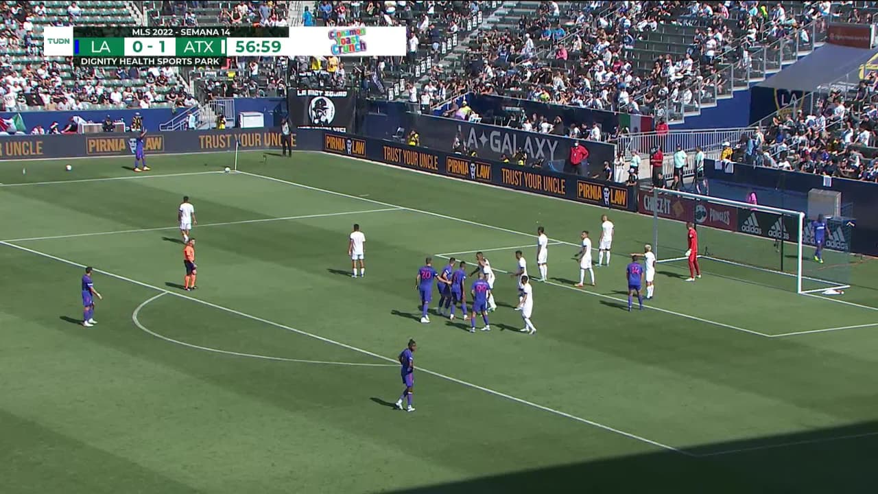 Tiro atajado raso al centro del arco. Kévin Cabral (LA Galaxy) Disparo con la derecha desde el lado derecho dentro del área.