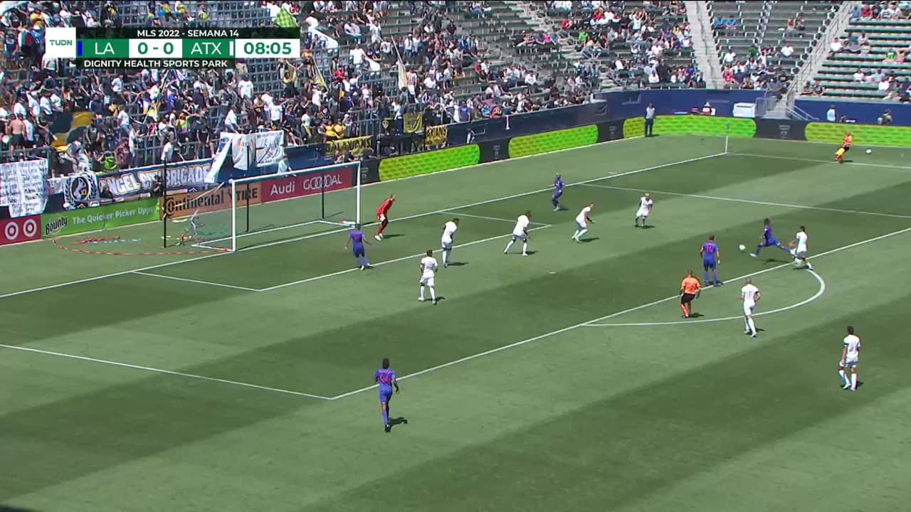 Tiro atajado. Rayan Raveloson (LA Galaxy) Disparo con la derecha desde fuera del área.