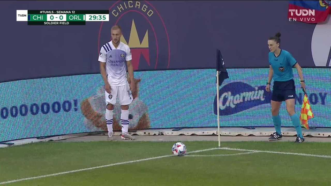 Tiro atajado. Rodrigo Schlegel (Orlando City SC) disparo de cabeza desde el centro del área.