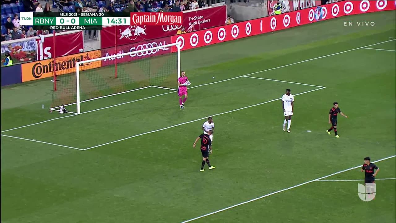 Tiro atajado. Wikelman Carmona (New York Red Bulls) zurdazo desde fuera del área.