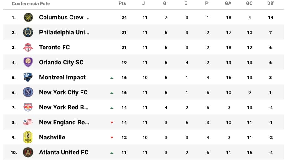 En resumen, estos son los líderes de la Conferencia Este: Columbus Crew (24 puntos), Philadelphia Union y Toronto FC (21).