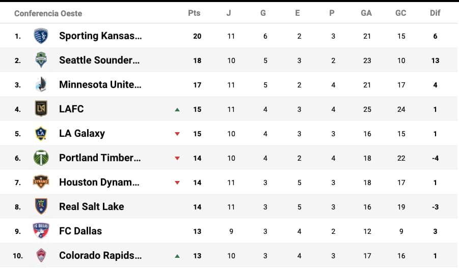 Y en la Conferencia Oeste: Sporting Kansas City (20 puntos), Seattle Sounders (18) y Minnesota United (17).