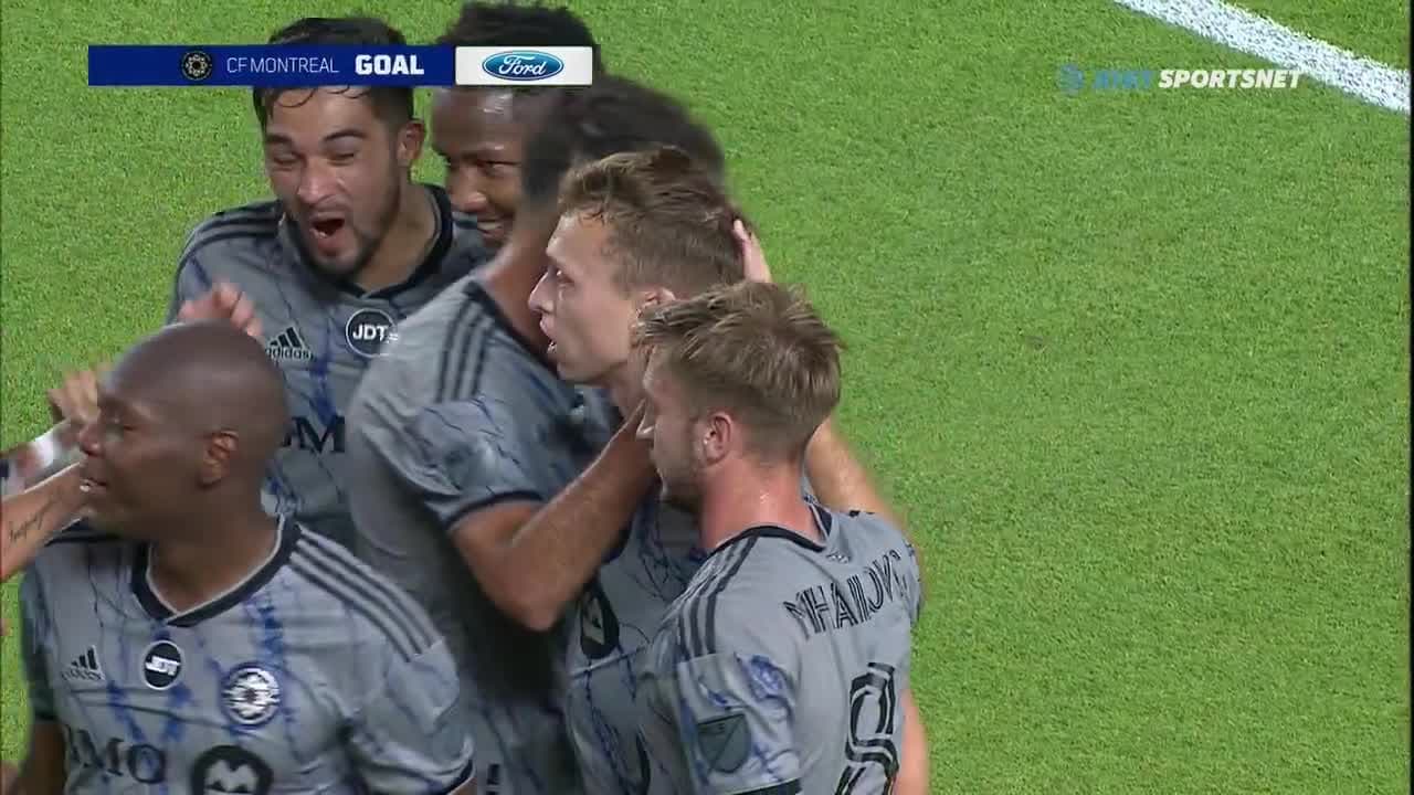 Tras una serie de rebotes, Alistair Johnston hunde el balón en la red para el 2-1 de Montreal