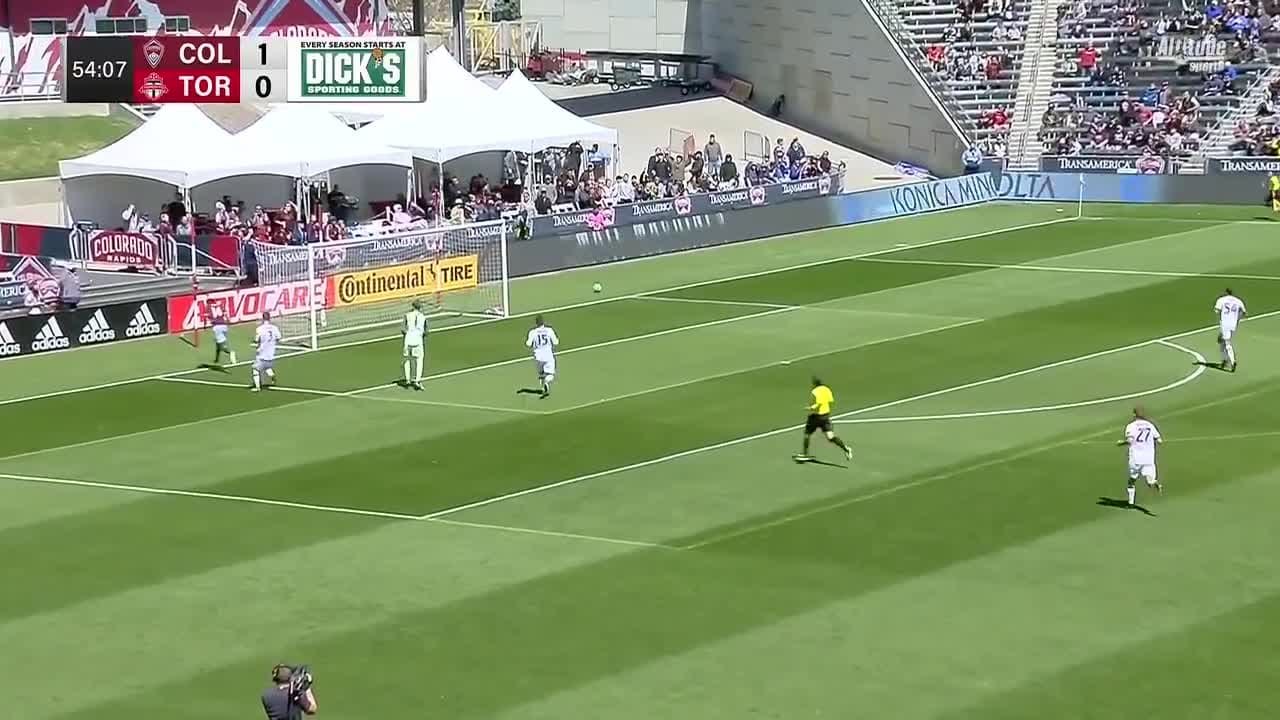 Dominique Badji estuvo cerca de anotar el segundo gol para Colorado pero su disparo se fue a un lado de la portería de Toronto.