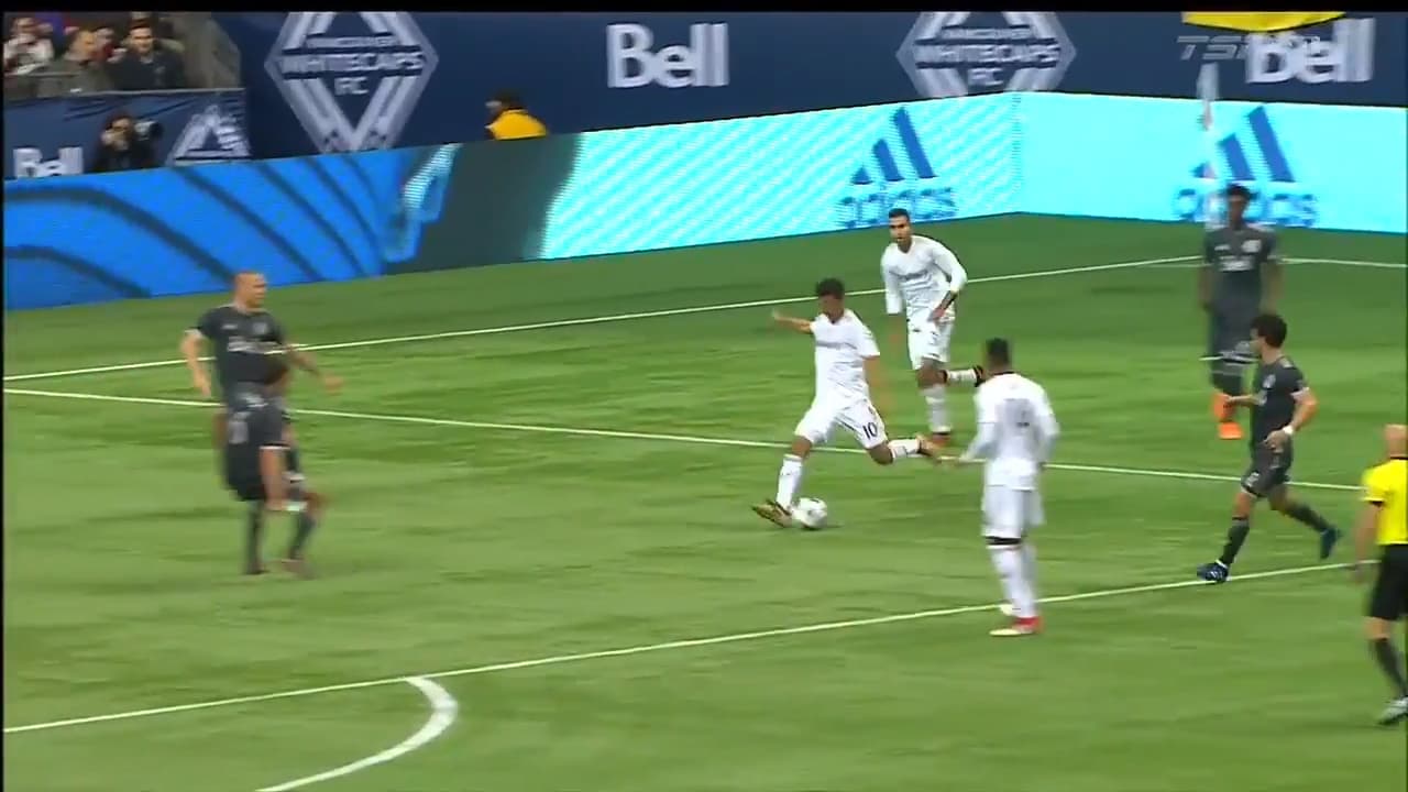 Marco Ureña lucha la posesión de la pelota y luego pasa a Carlos Vela, quien perfora la red de Vancouver con su cuarto gol de la temporada