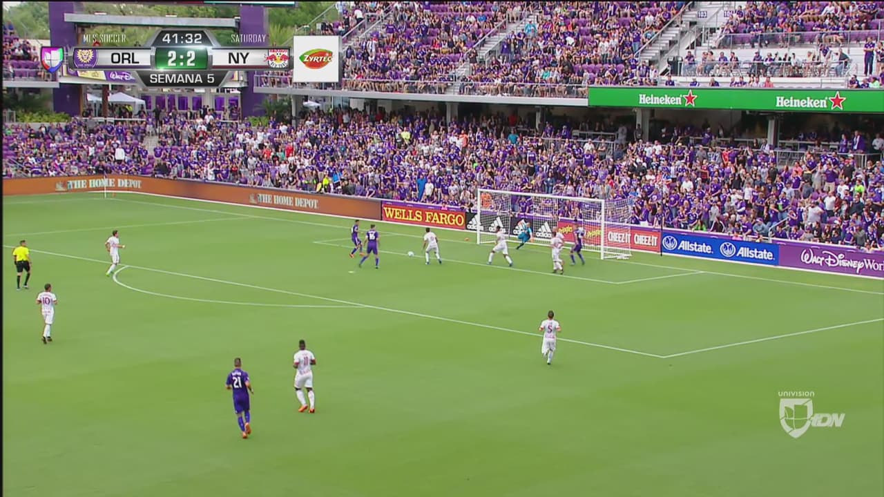 Justin Meram sirve un balón espectacular dentro del área, pero el mediocampista peruano no pudo conectar correctamente y Red Bulls se salvo del tercero.