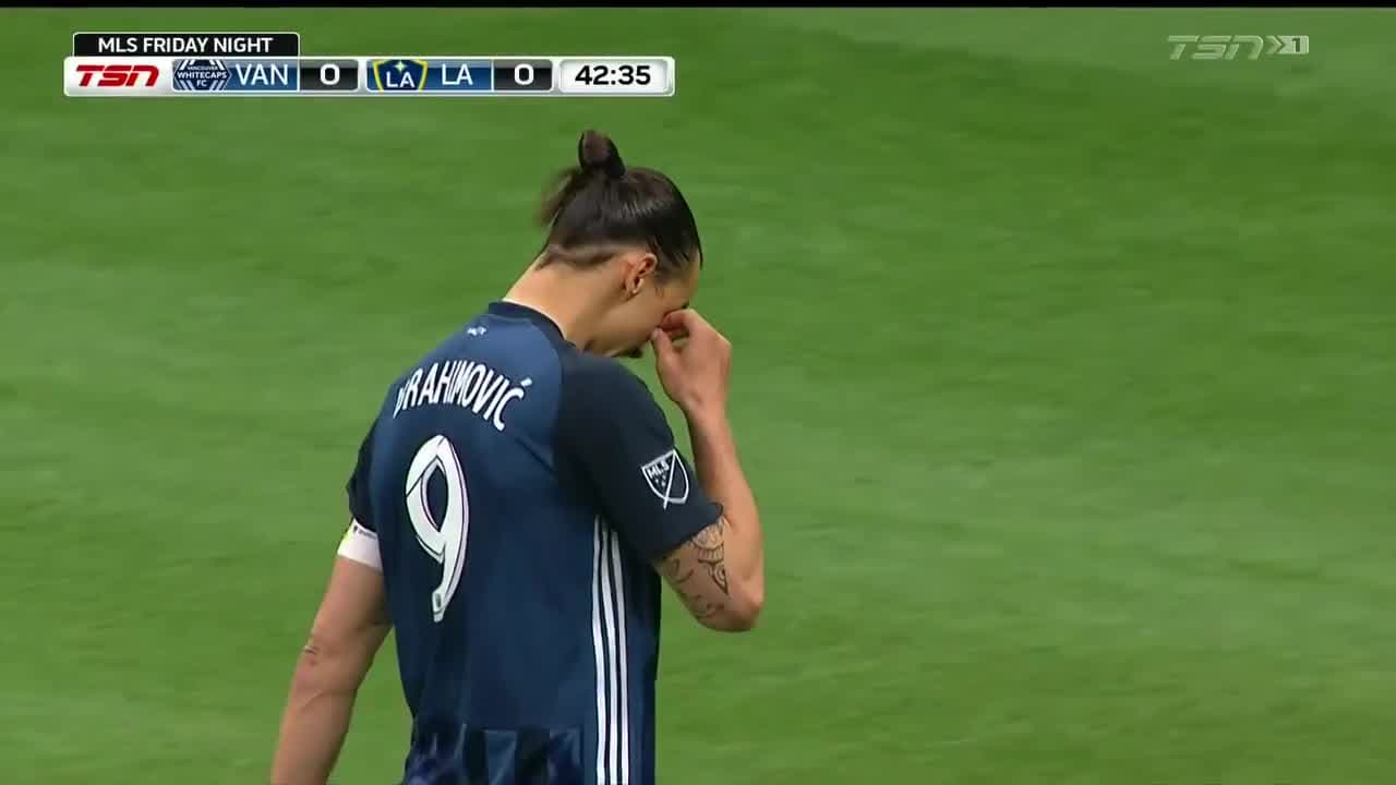 En jugada de pelota detenida, el delantero sueco saca un remate que se desvía en un defensa y pasa muy cerca del arco de los Whitecaps