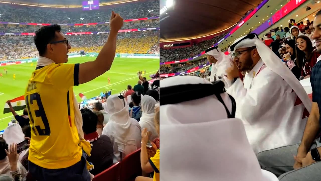 Un fanático de Ecuador hizo una seña acusando de soborno por el gol anulado a Enner Valencia lo que provocó la molestia de un aficionado de Catar.