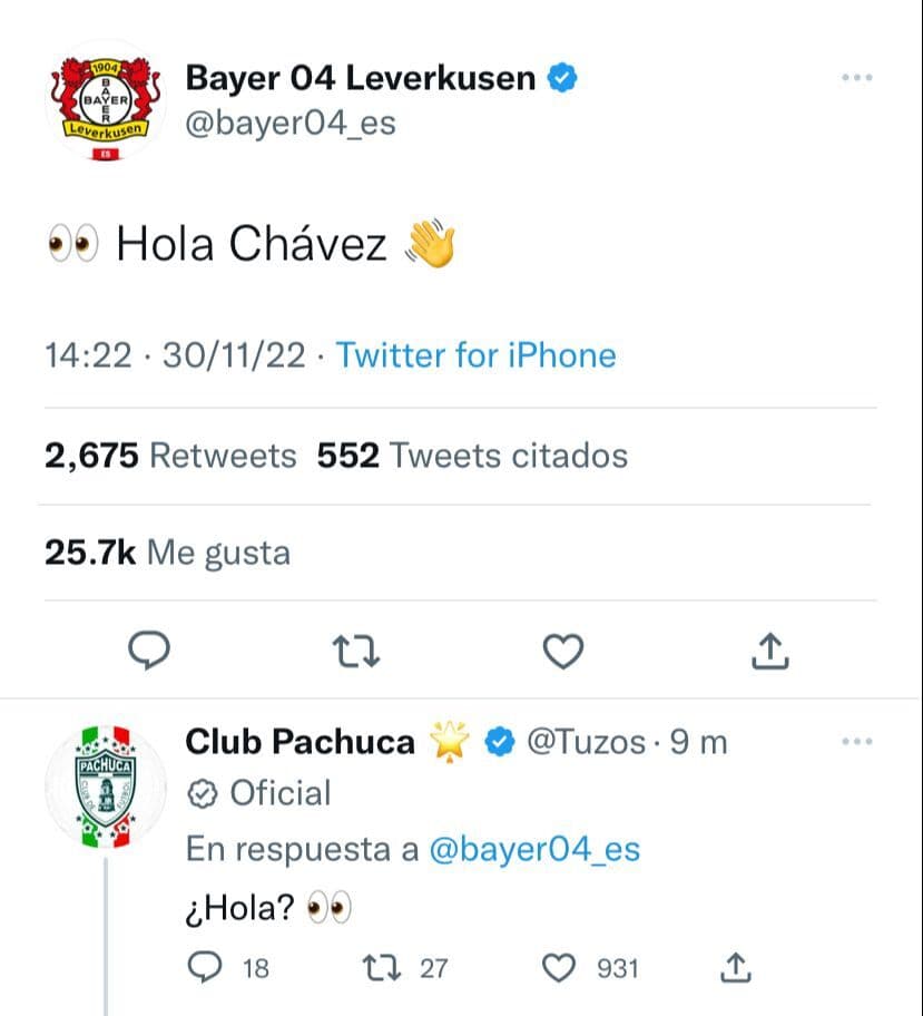 Las Aspirinas publicaron en su cuenta oficial de Twitter un saludo hacia Chávez, sin arrobar al jugador de 26 años, lo que generó una respuesta por parte del Pachuca, quienes devolvieron la deferencia.