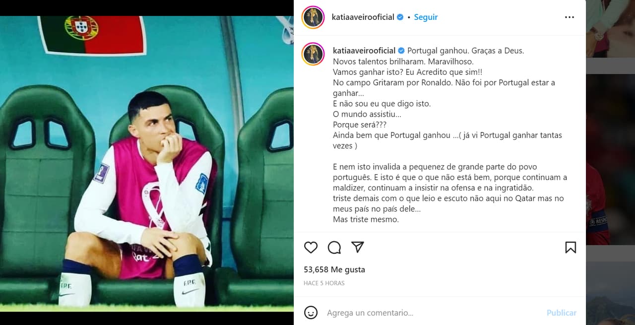 Kátia Aveiro también destacó que durante el partido Portugal vs. Suiza, los aficionados presentes en el Estadio Lusail de Catar corearon el nombre de Cristiano Ronaldo para hacerse presente en la cancha, algo que surtió efecto al minuto 73 tras relevar a Joao Félix con el marcador 5-1 parcial y que al final ganaron los portugueses 6-1.