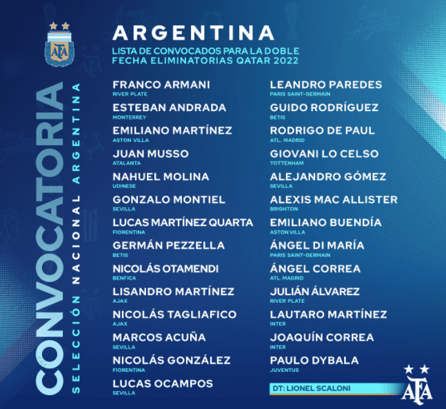CONVOCATORIA DE ARGENTINA PARA ELIMINATORIAS RUMBO A QATAR 2022
