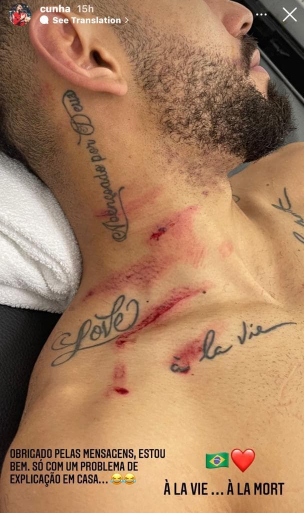 El futbolista del Atlético de Madrid en LaLiga, se tomó con buen humor lo ocurrido y publicó una foto en Instagram en la que se distinguen las heridas entre el cuello, el hombro y el pecho y comentó: "Gracias por los mensajes, estoy bien. Sólo con un problema para explicar esto en casa".
