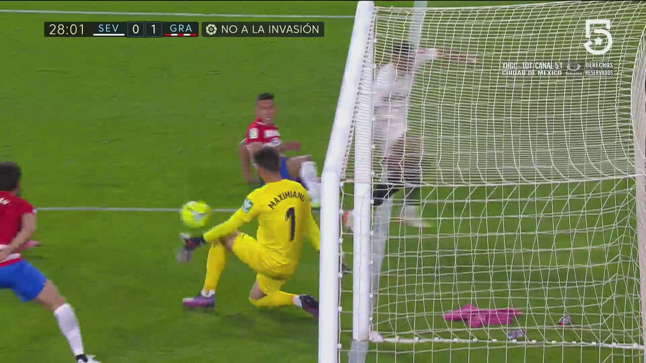 El delantero del Sevilla se coló en el área, pero Maximiano aguantó bien y atajó al 27’.