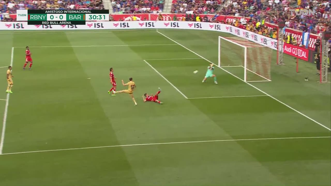 Raphinha hace la recepción y asiste para el polaco que dispara a quemarropa y es atajado por el guardameta.
