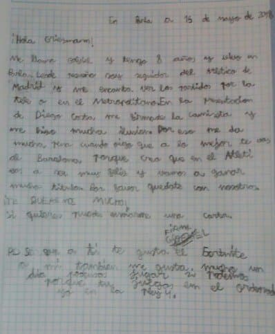 Me llamo Gabriel y tengo 8 años y vivo en Parla. Desde pequeño soy seguidor del Atlético de Madrid y me encanta ver los partidos por la tele o en el Metropolitano. En la presentación de Diego Costa me firmaste la camiseta y me hizo mucha ilusión. Por eso, me da mucha pena cuando oigo que a lo mejor te vas al Barcelona porque creo que en Atleti vas a ser muy feliz y vamos a ganar muchos títulos.