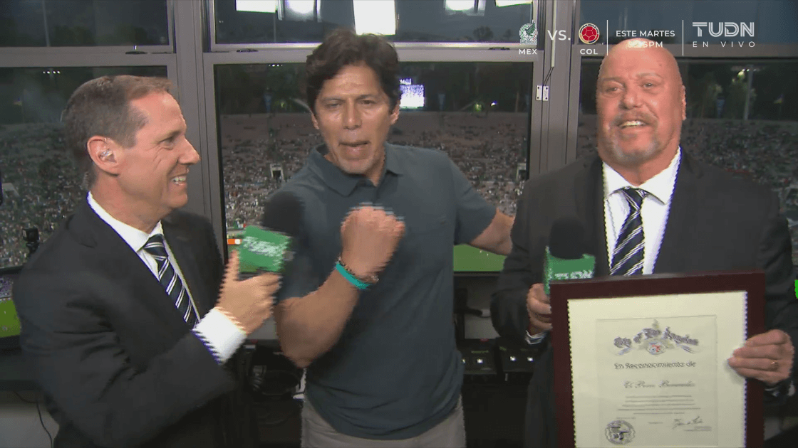 Kevin de León, Concejal de Los Ángeles, entrega una placa a Enrique Bermúdez por su gran trayectoria.
