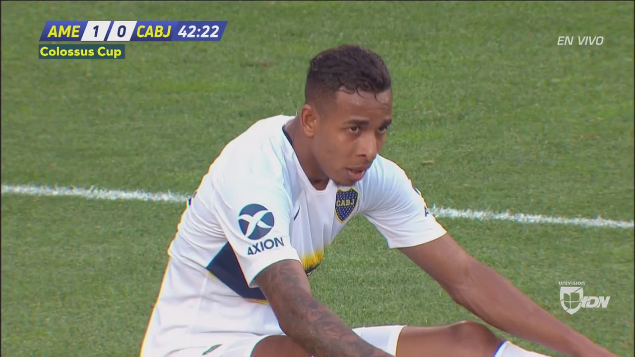 Gran pared del colombiano con Carlitos Tevez que le filtró la pelota, la cual ganó con más potencia que los americanistas.