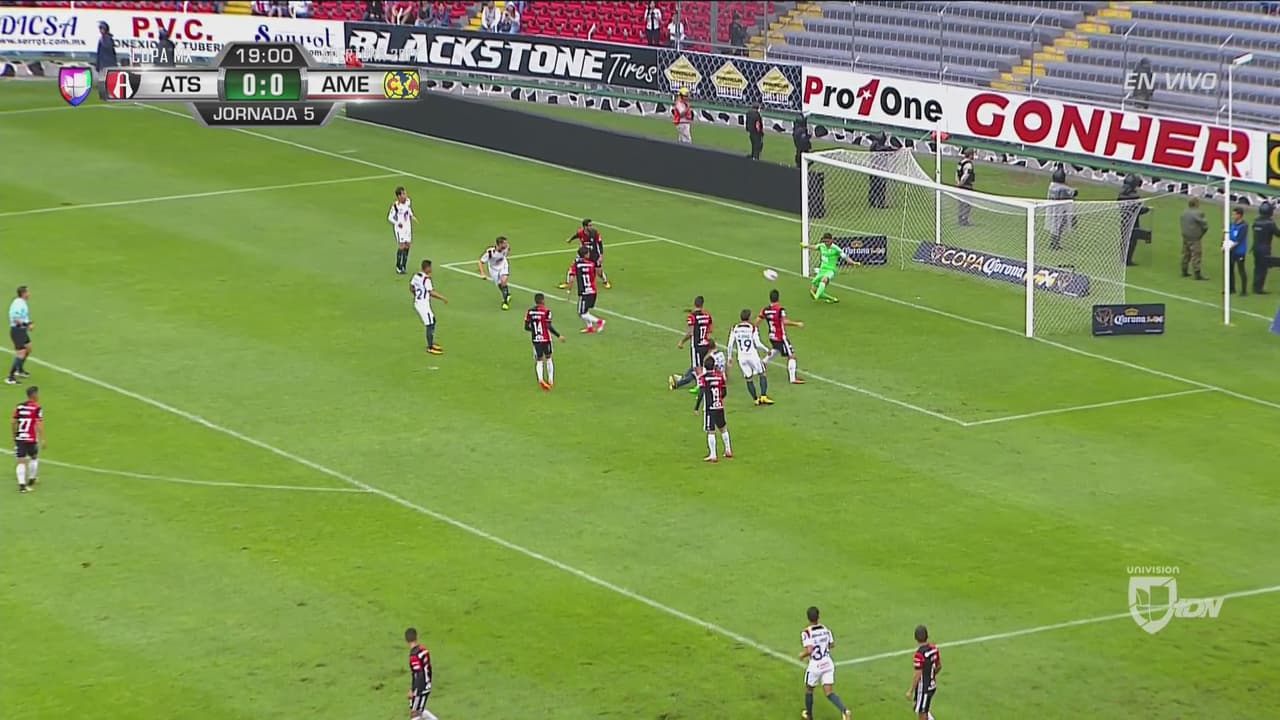 El mediocampista del América Guido Rodríguez remata desde el corazón del área rojinegra, pero su disparo es desviado milagrosamente, con el pie, por parte del guardameta del Atlas.