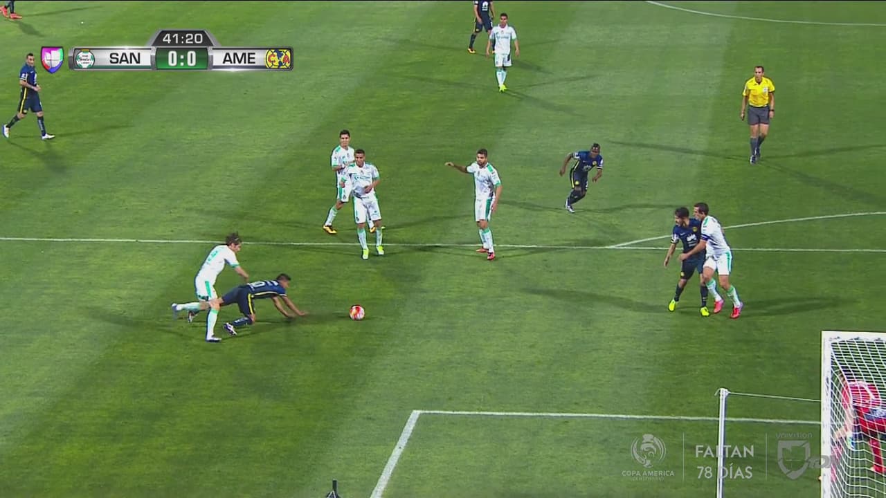 El jugador americanista recibe un empujón en el área de Santos, pero el árbitro dice que no es penal.