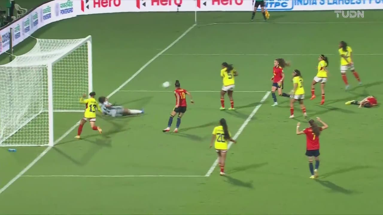 España provocó caos en casa en área de Colombia, y la portera logró salvar su meta al 43’.