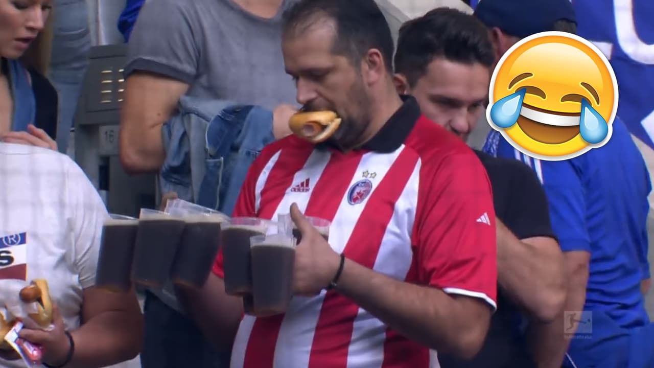 Para el Cirque du Soleil: lo captan llevando un perro caliente en la boca y ocho cervezas en las manos