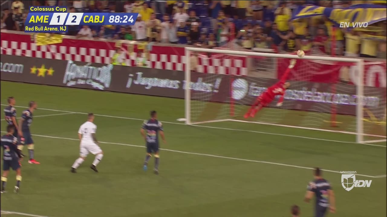 Lisandro López remató de cabeza un servicio de Marcone y el arquero del América tapó la pelota con un manotazo; luego se salvó de regarla por una fuera de lugar.
