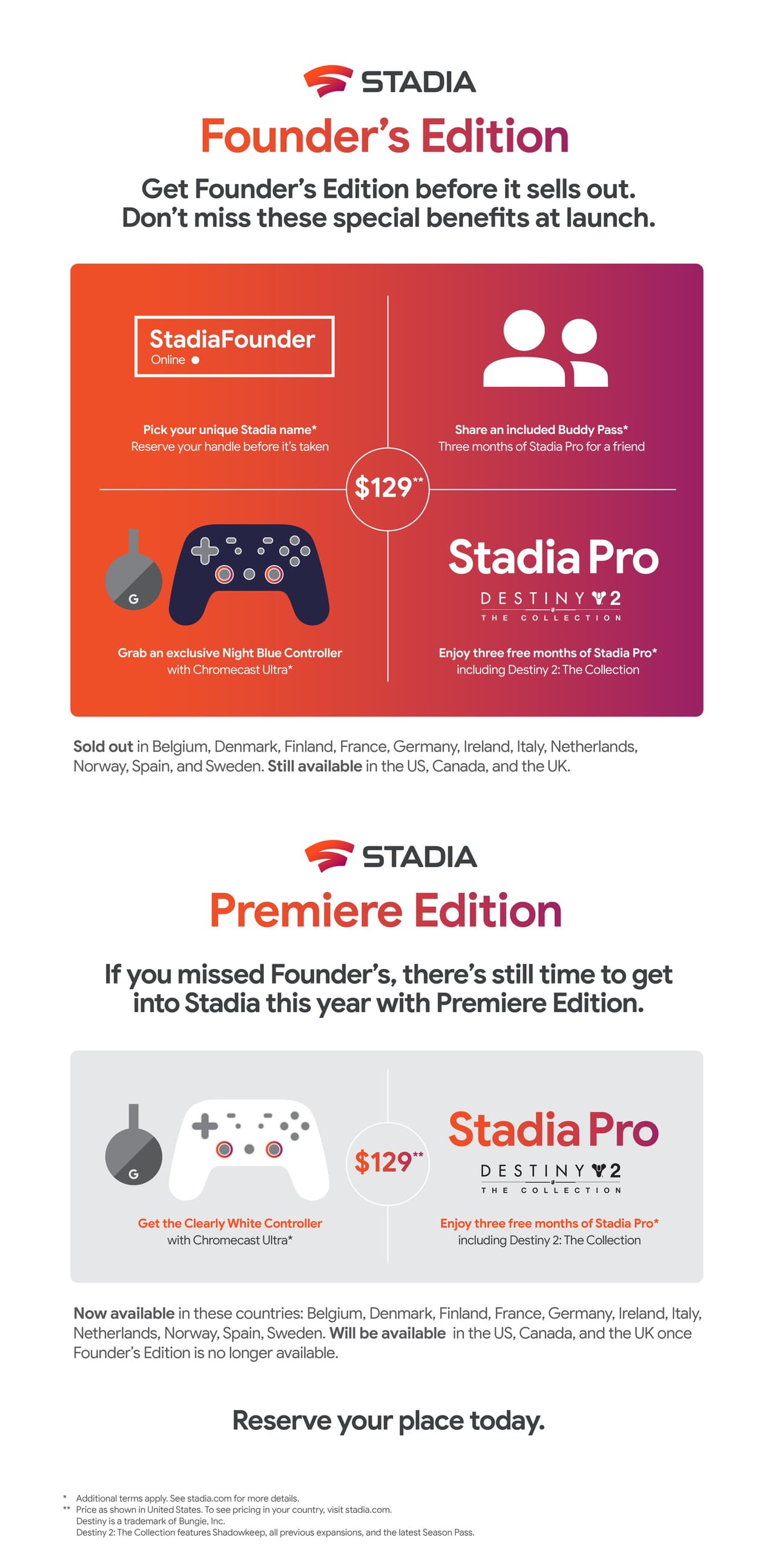 Recordar que no todos los titulos estan disponibles de forma gratuita, la mayoría se compra de manera individual. Google ha puesto a la venta lo que ha llamado Founder's Edition, paquete que incluye el mando de Stadia en un azul oscuro, un Chromecast Ultra, una suscripción de 3 meses a Stadia Pro y el juego Destiny 2. Todo por 129 euros. El juego llegará primero a Estados Unidos, Canadá, UK y Europa.