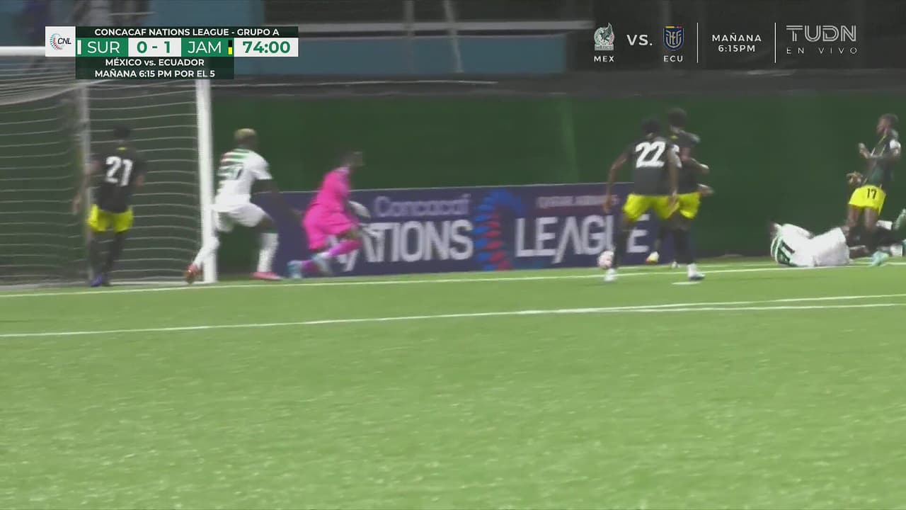 El delantero de Surinam ingresa con pelota controlada y mandan al césped, al minuto 73.