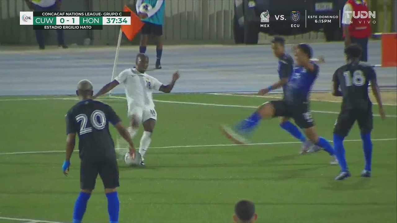 Curazao insiste para empatar el marcador, pero la defensa hondureña lo evita con un buen cruce.