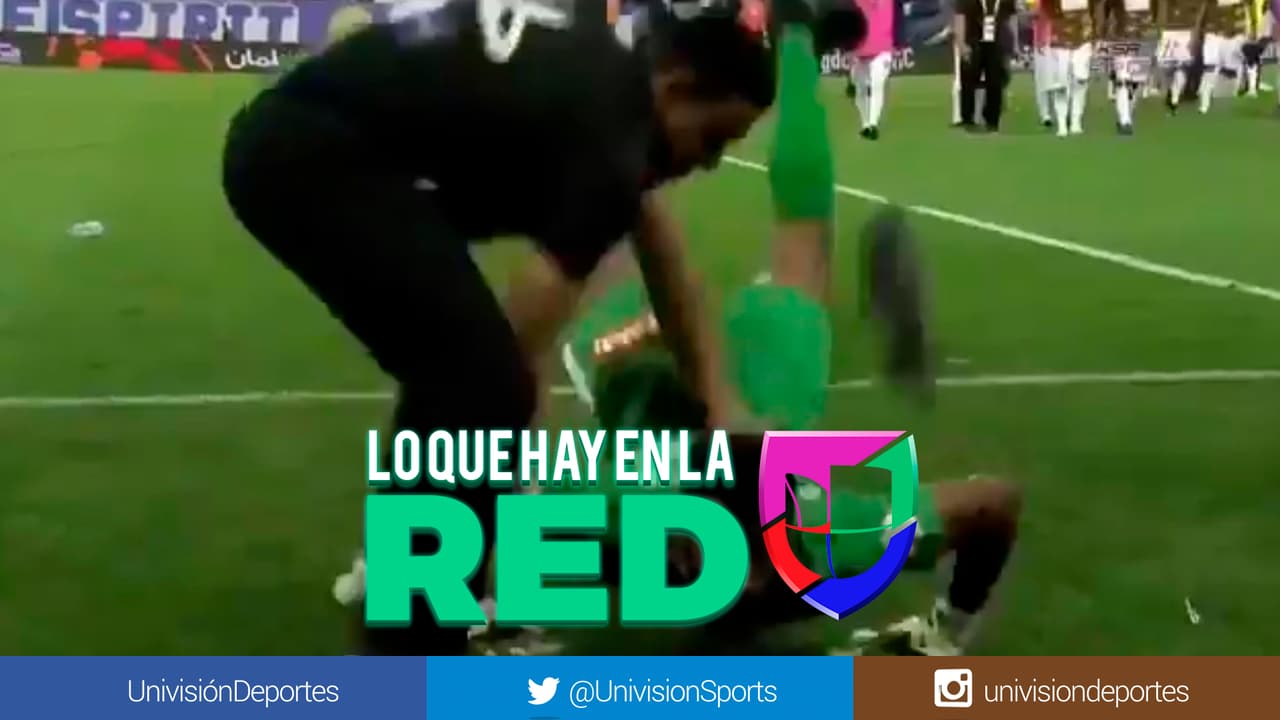 Un arquero del Ohod, equipo que va último en Arabia Saudita, celebra haber salido con su arco en ceros contra el Al Hilal, líderes del torneo, haciendo el gesto de un gusano mientras los fanáticos le arrojan todo tipo de objetos.