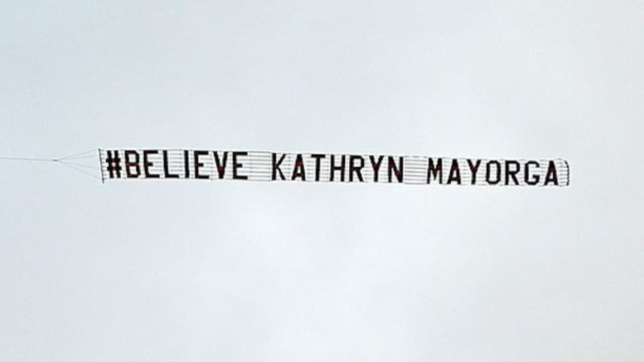 Y la pancarta que aparecía sobre los aires del inmueble del teatro de los sueños se leía lo siguiente "Creanle a Kathyn Mayorga" ,la pancarta fue puesta en el aire por un grupo de justicia de género llamado Level Up.