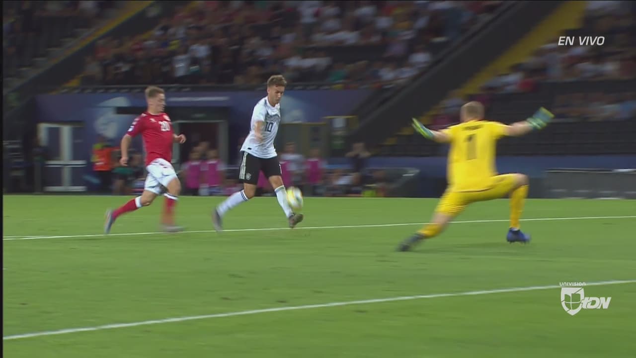 La jugada de la selección 'Teutona' inició desde su propia área después de un tiro de esquina de los daneses, los cuales no lograron contener a Luca Waldschmidt, quien definió como todo un carck.