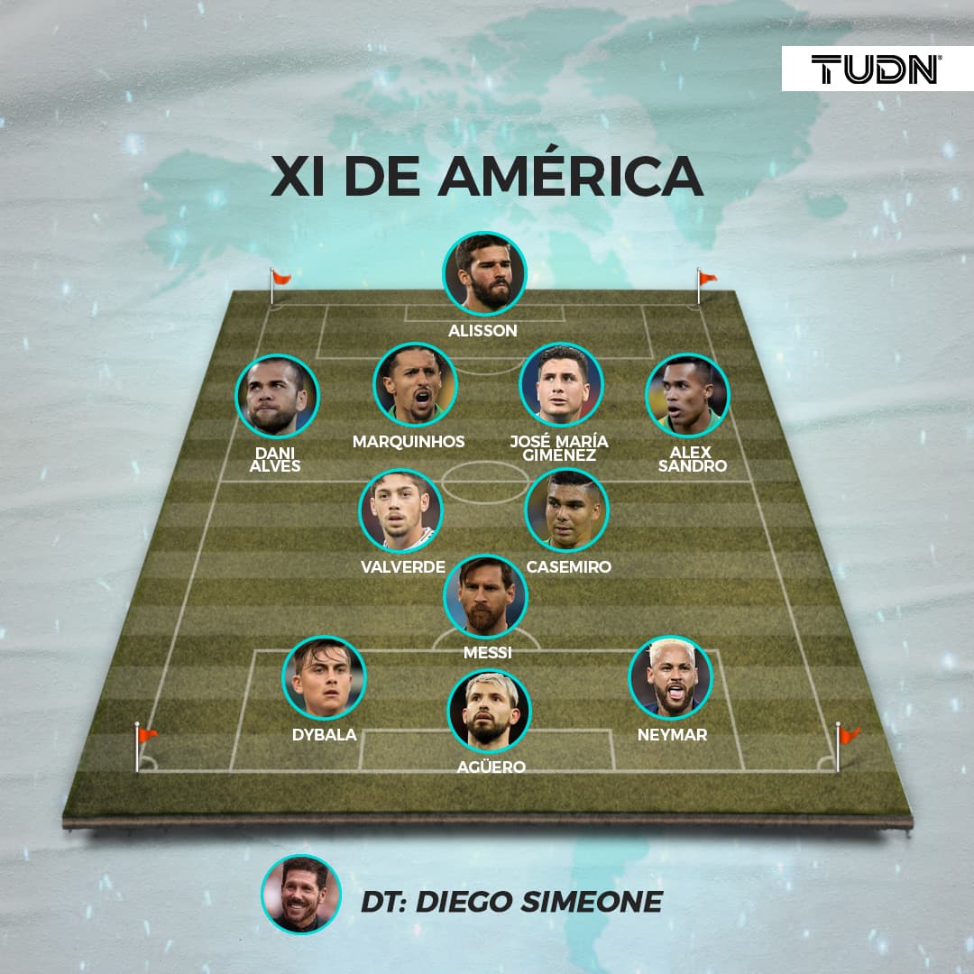 Del lado de América, los que figuran son únicamente de tres países diferentes: Argentina, Brasil y Uruguay, las tres mejores selecciones en Sudamérica, con Lionel Messi y Neymar a la cabeza de este combinado.
