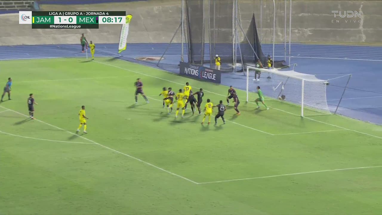 El delantero de Jamaica se anticipó a su marca y metió un cabezazo frontal que fue a dar al travesaño.