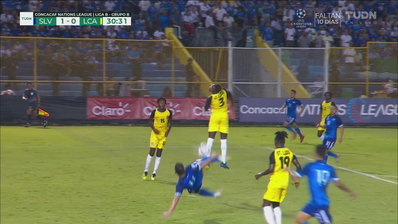 Rodolfo Zelaya conecta el balón con una cabriola en el aire y la pelota se va alta.
