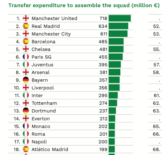 Con esta frase, el Observatorio del Fútbol del Centro Internacional de Estudios Deportivos, con sede en Neuchatel, Suiza, describe las colosales cantidades movidas por el United cuando pagó 110 millones de euros por Paul Pogba a la Juventus de Turín. El segundo club que más millones gastó en ensamblar su actual equipo fue el Real Madrid con 634 (713 millones de dólares) y el tercero fue el Mánchester City con 611 (687 millones de dólares). Barcelona aparece en cuarta posición.