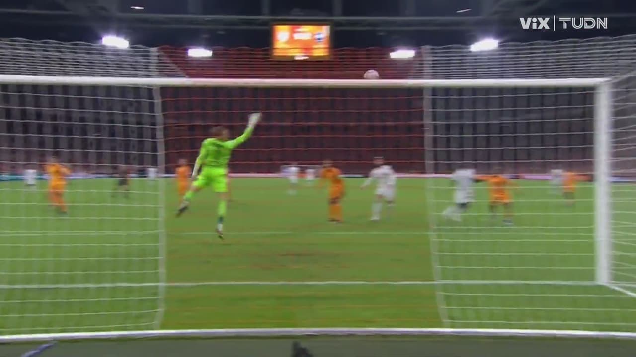 la defensa holandesa no sabe que hacer con Kylian y la pura suerte evita la tercer caída de su arco.