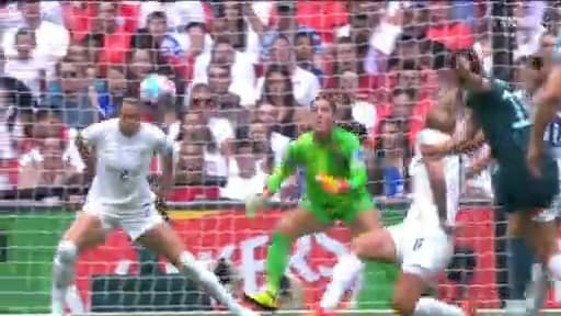 La alemana llegó plena para disparar, pero la lateral inglesa aguantó con valentía y alejó el peligro.