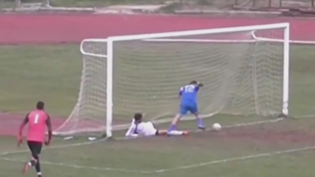 Este delantero, de la liga de Grecia, tuvo el mérito de robarle la pelota al arquero pero se nubló al llegar a la línea del arco. Se tomó un tiempo de más y se lo comieron.