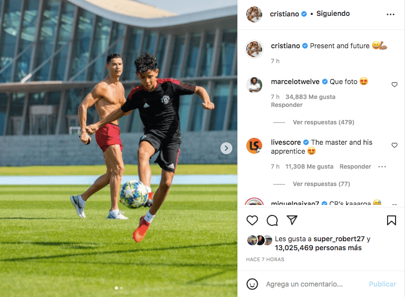 Cristiano Ronaldo es una de las figuras más importantes del futbol actual y no tuvo empacho en presumir al que será el futuro crack mundial, luego de postear una foto en la que aparece detrás de su hijo bajo la frase “presente y futuro”.