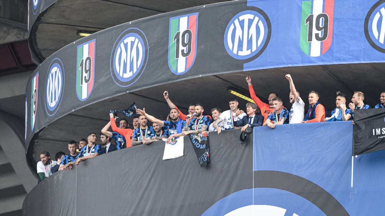 Los jugadores festejan con cientos de seguidores neroazzurri a las afueras de San Siro.