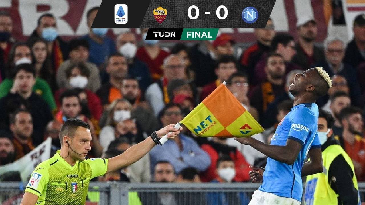 Su Roma sufrió en la mayoría del choque ante la posesión del Nápoles, que rozó dos veces el gol a la hora de partido. Un magistral pase al hueco de Fabián liberó a Giovanni Di Lorenzo, cuyo centro, rematado por el nigeriano Victor Osimhen, se estrelló en un poste tras una desviación decisiva de Gianluca Mancini.