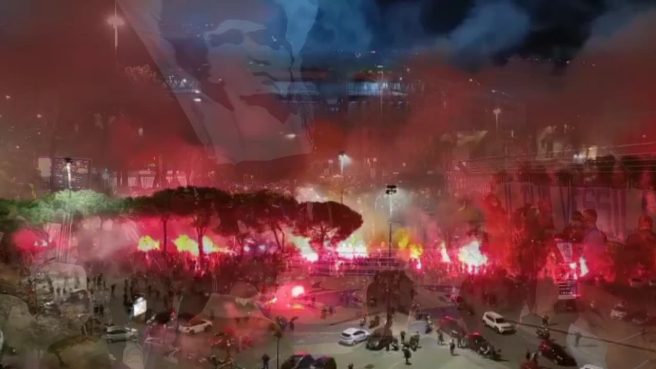 El momento más emotivo a las puertas del estadio se vivió cuando cientos de tifosi encendiueron bengalas rojas cubriendo la fachada con su humo y coreando el lema "¿eh, mamá sabes por qué me late el corazón? porque he visto a Maradona".