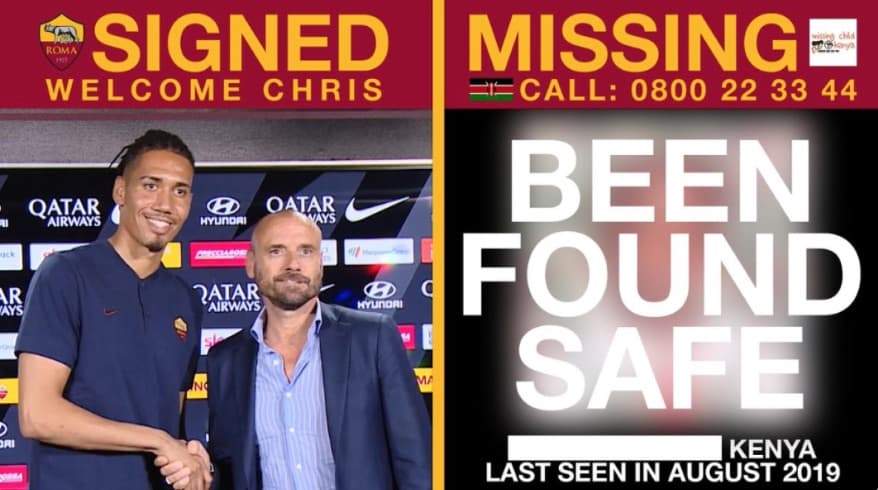 La publicación del club italiano decía: “¡Se ha encontrado a un cuarto niño desaparecido! #ASRoma ha sido informado hoy de que una niña de Kenia de 8 años que aparece en el video del anuncio de transferencia de Chris Smalling fue encontrada a salvo”.