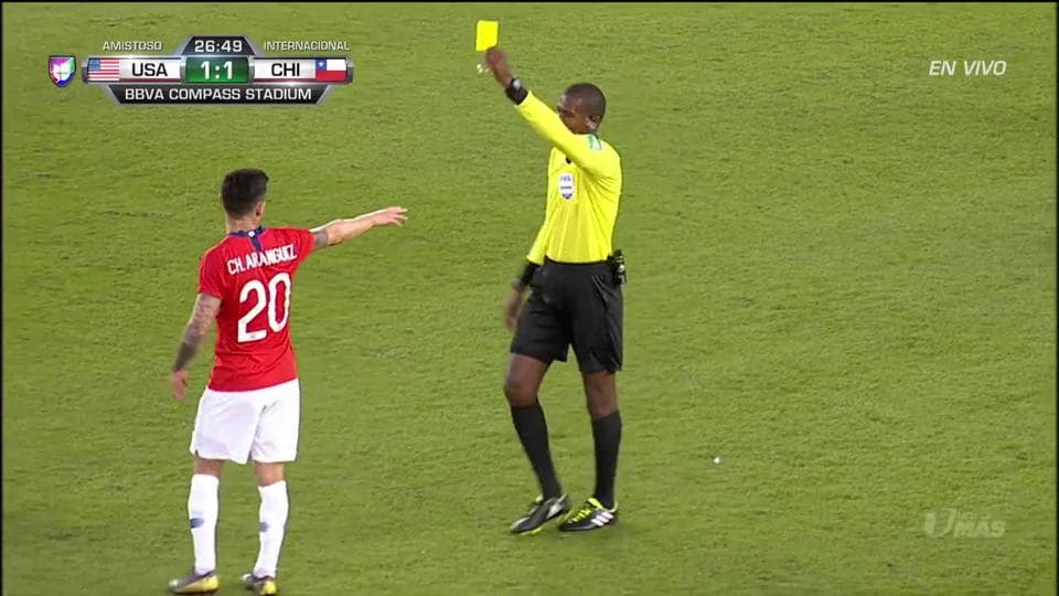 Tarjeta amarilla. El árbitro amonesta a Esteban Pavez de Chile