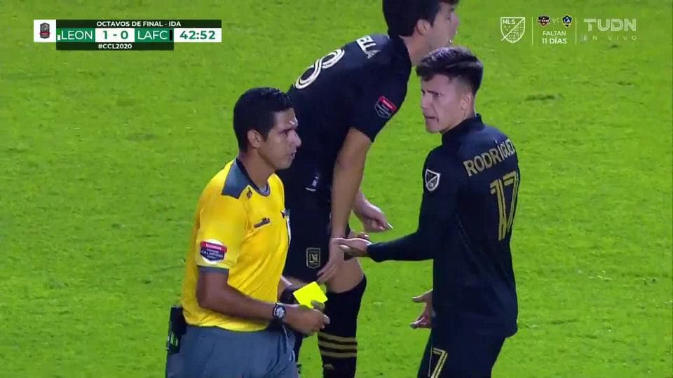 Tarjeta amarilla. El árbitro amonesta a Latif Blessing de Los Angeles Football Club on February 18, 2020
