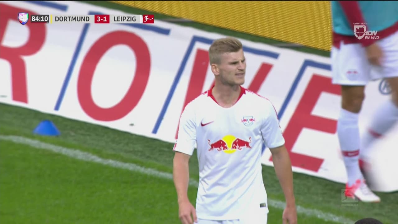 El delantero del Leipzig ingresó al área y realizó un potente disparo de pierna izquierda que el arquero del Dortmund mandó a tiro de esquina.