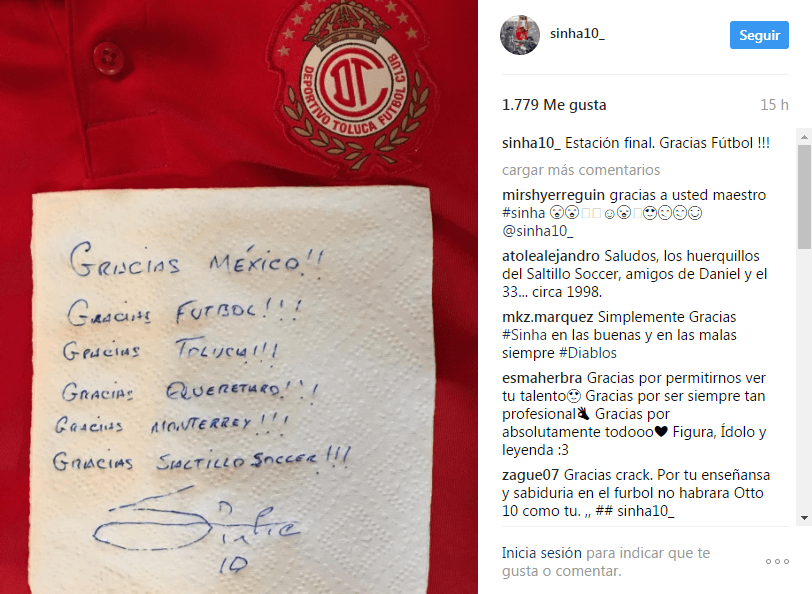 Sinha escribió una nota en la cual agradeció a cada uno de los clubes con los que jugó en la Liga MX, incluyendo también a México en general y también al Saltillo Soccer.