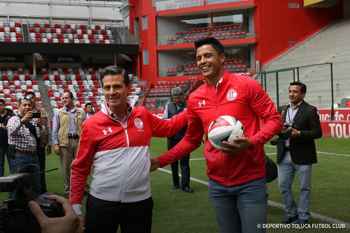 El mandatario mexicano develó una placa conmemorativa a la remodelación del estadio Nemesio Diez en compañía del dirigente del club mexiquense, Valentín Diez.